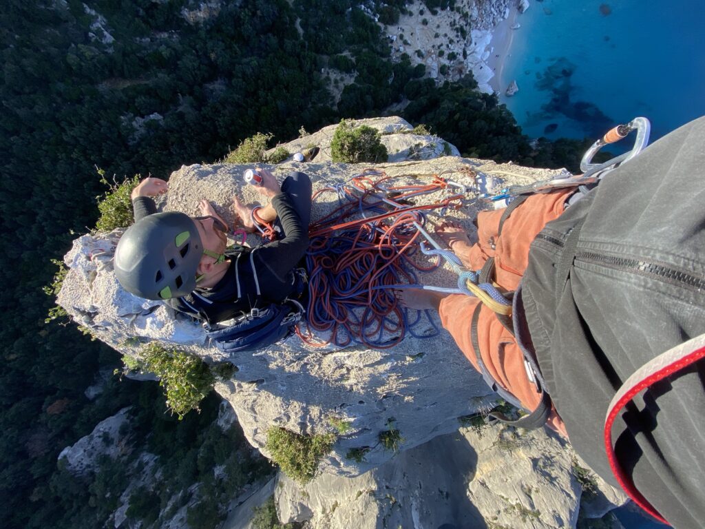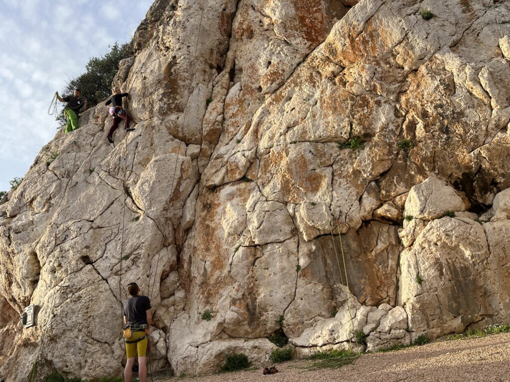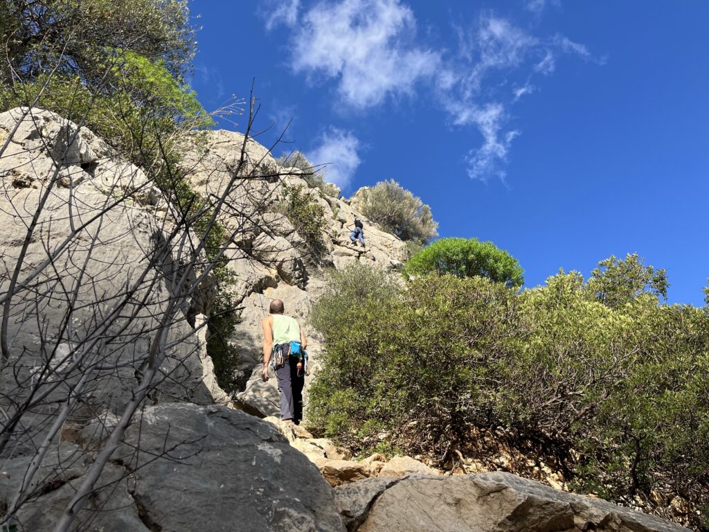 Já si nechávám dodávku a vezu Marťase a Barču na lehčí lezecké cesty do Cala di Fuili. Tato oblast je však, narozdíl od ostatních v zálivu Golfo di Orosei, tak dobře přístupná, že jsou odpoledne už stěny obležené jinými lezci. Zbyde na nás jedno 4b a pak pěkně zarostlá 5a, ze které unikám a nechávám ve stěně šroubovací karabinu.