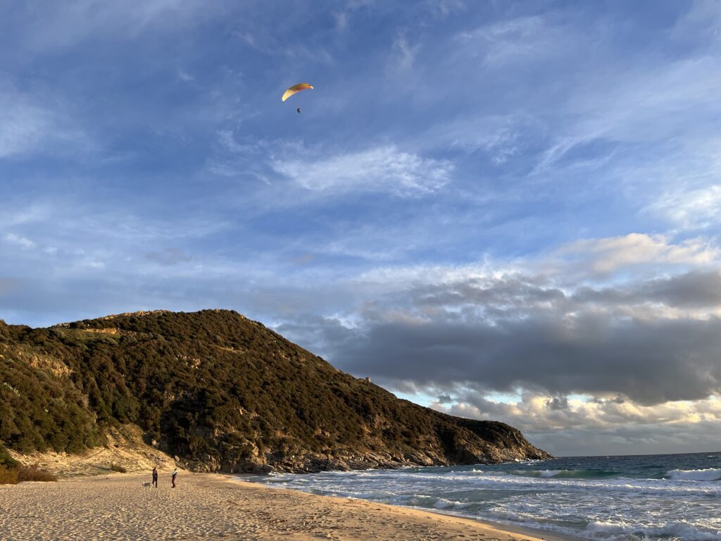 K večeru nás Martin zavede na Spiaggia di Solanas, kde se chvíli nosí na paraglidu nad naší hlavou.