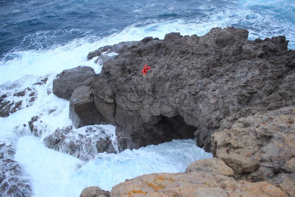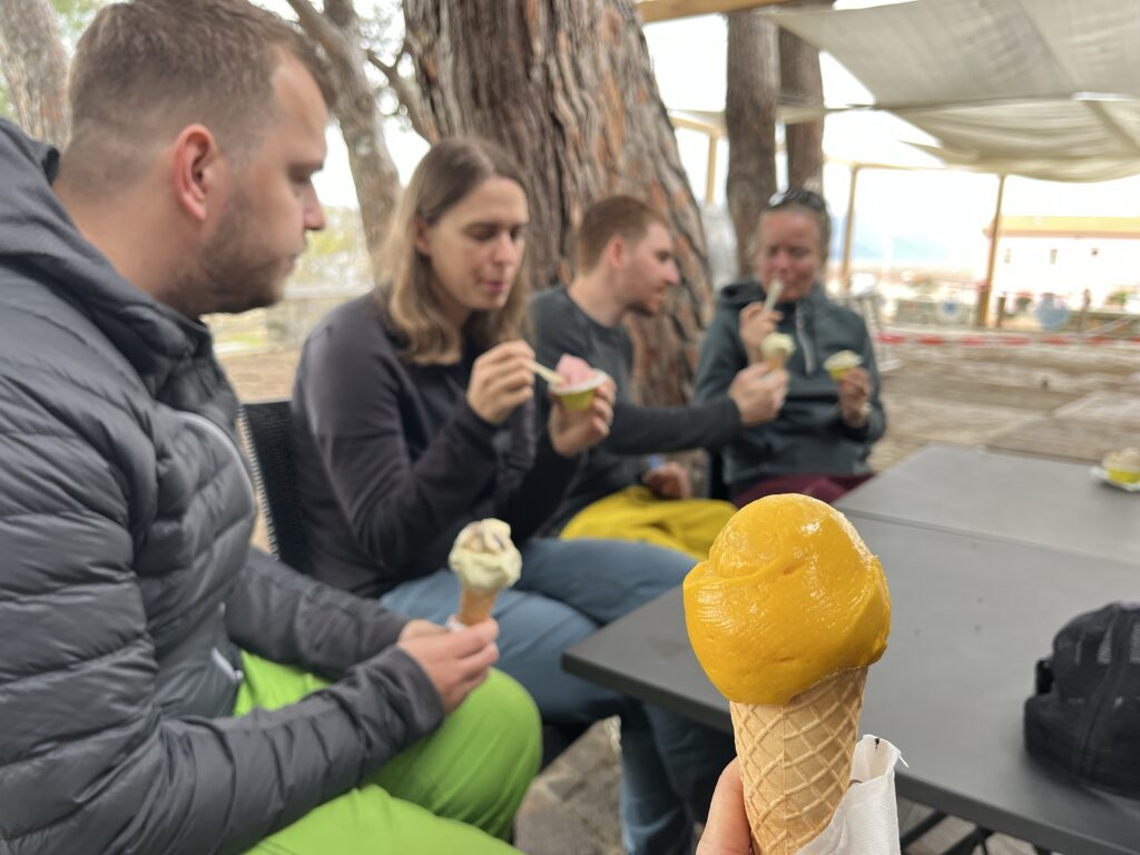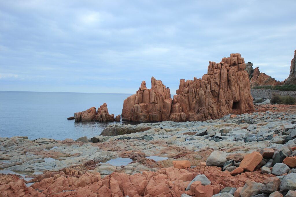 Na červené skály Scogli Rossi, které jsou opodál, se ale neleze. Ty si jen vyfotíme a v kavárně poblíž si objednáme zmrzlinu a pistáciový croissant.