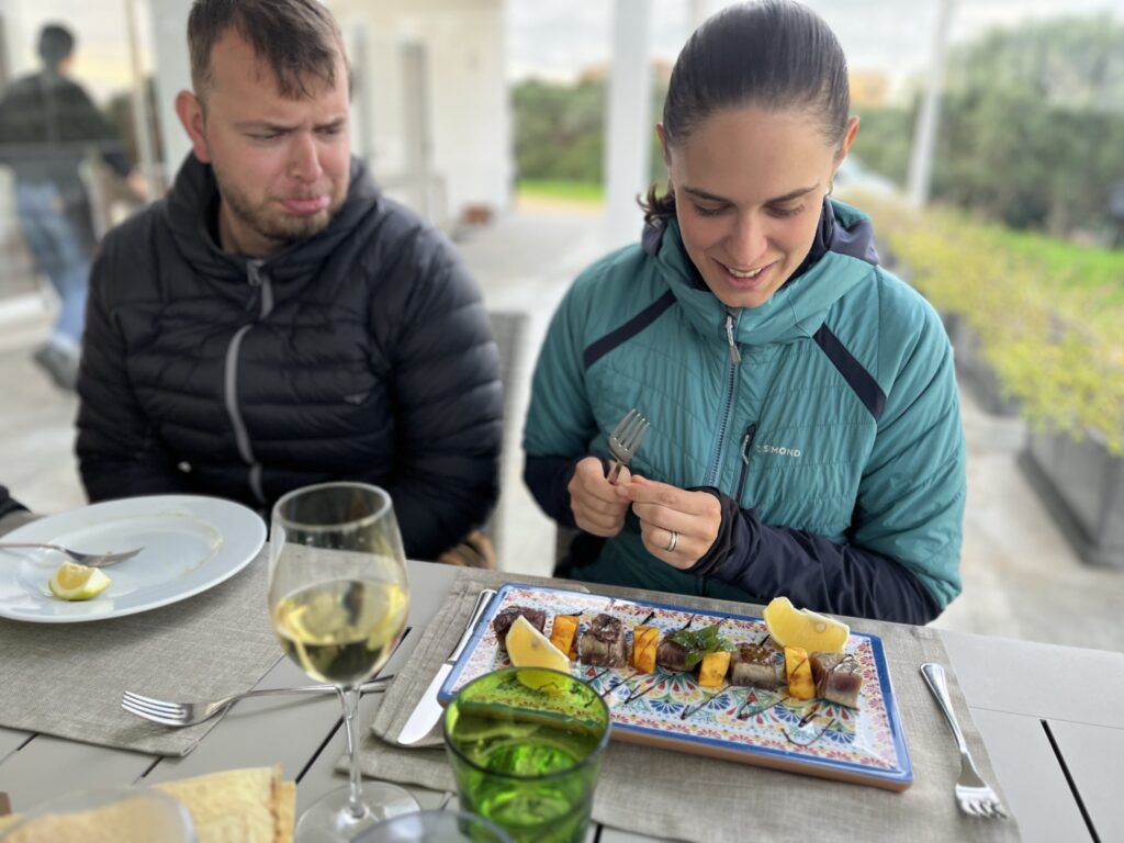 V domácí restauraci Villa Giulia si objednáme mořské speciality, víno i zákusky. A i když jsme Důšu nakonec nevzali do Artisana, kam celou dobu toužil jet, vypadá nakonec šťastně.