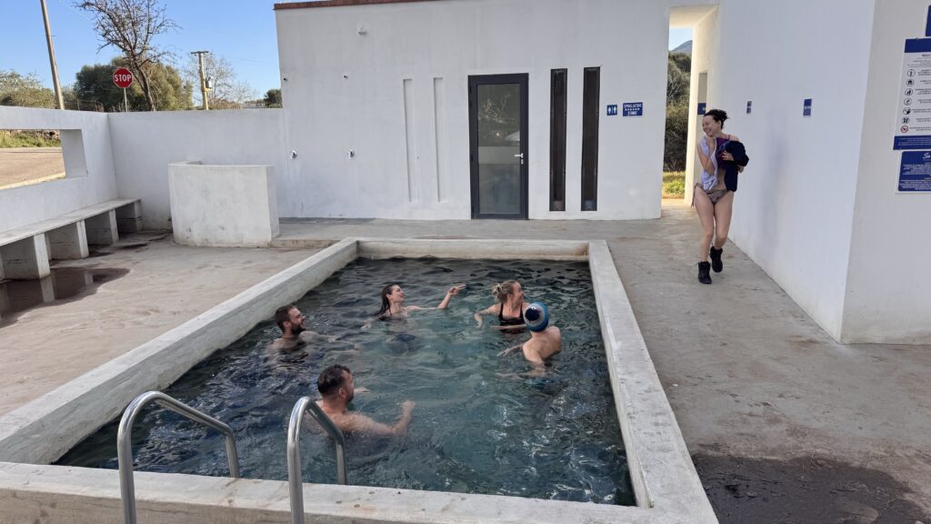 Nakonec se večer potkáváme u kostela kousek nad Dorgali, kde za rohem nacházím ráno termální bazén.