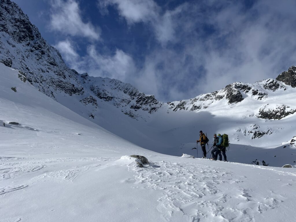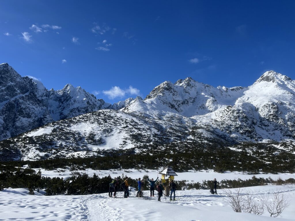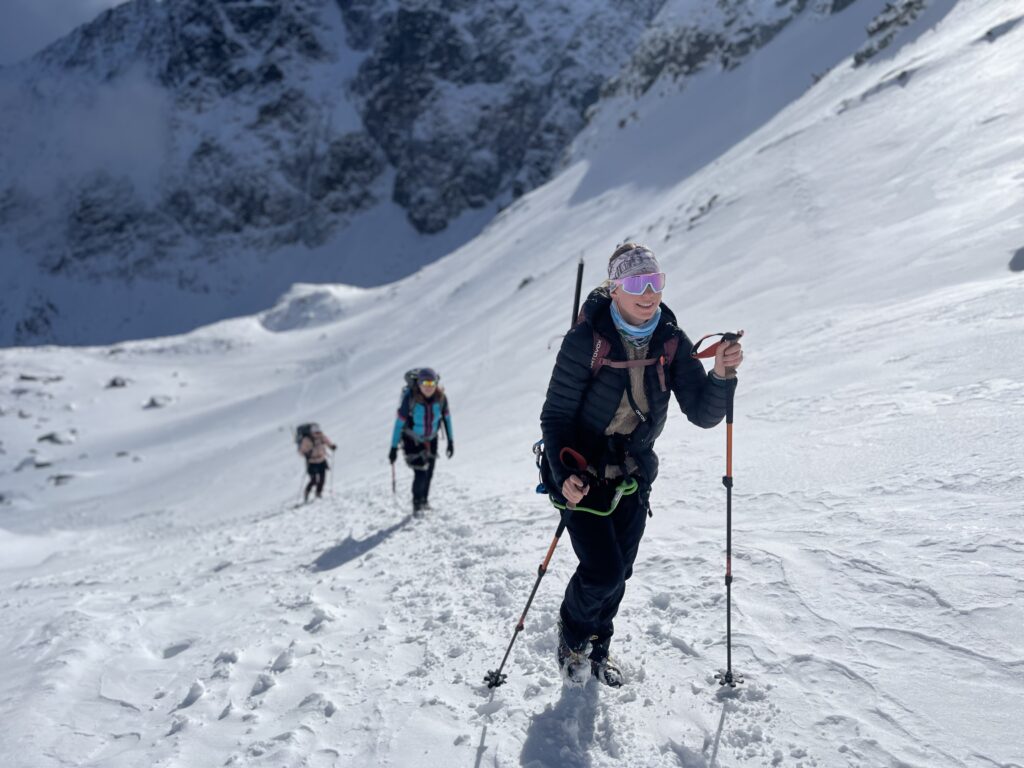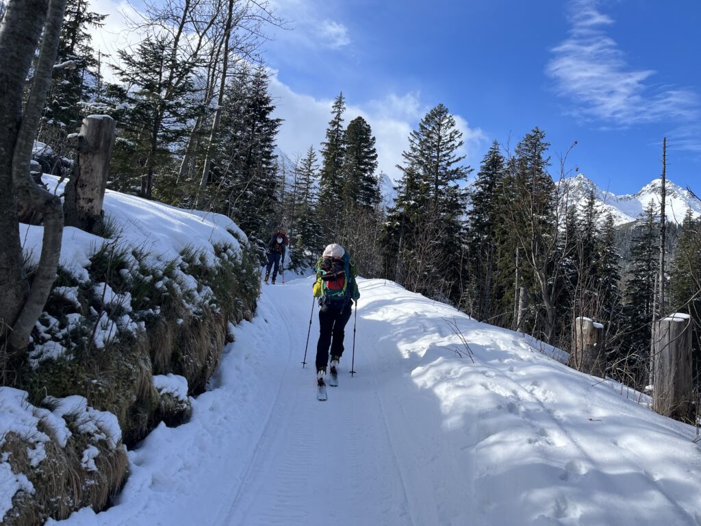 K snídani švédský stůl – párky, vajíčka, sladká buchta. Horký čaj mi zase nalijou zdarma do termosky. Koukneme na lavinový stupeň a pokud se nezvýší na trojku, můžeme spřádat plány na velevýstupy. Klasika je Kopské sedlo s protažením na Hlúpy nebo Červená Dolinka a štíty nad ní. Zkušenější si vyberou směr na Baranie Rohy, pohodáři půjdou kosovkou na Chatu Plesnivku. Ať už to bude cokoliv, slunce se velmi brzy protlačí nad Dolinu a užiju si horský vzduch a modré nebe. Jak to v Tatrách bývá, i během pár minut se může cokoliv změnit. Často se přes štíty převalí mlha nebo je sníh najednou méně stabilní než níž. Cítím úlevu, že mi na hrudníku poskakuje zapnutý pípák a v báglu mám připravenou lopatu, kdyby něco. Čelovka a termoska se sušenkou jsou taky důležitá výbava.