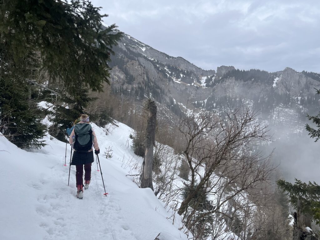 Ze sedla se stočíme vpravo na Ulrichshorn. Vyšlapaná cesta ve sněhu nám urychluje postup vpřed. Na vrcholu dokonce máme k dispozici lavičku. Kdo se sem s ní táhl?